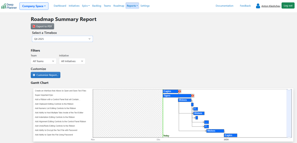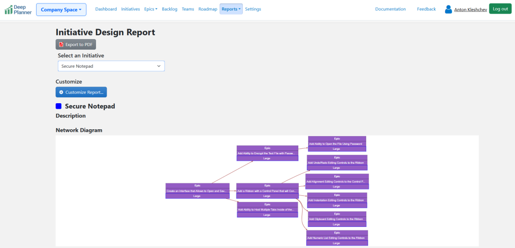 Reports are a vital mechanism to provide transparency and updates for stakeholders. Deep Planner currently provides two reports: Roadmap Summary report and Initiative Design report. All reports are available in both online preview and a PDF export.